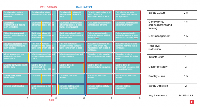 CREATE TABLE public.rafrequence ( codice CHARACTER VARYING(11) NOT NULL, descrizio CHARACTER VARYING(51), severity INTEGER ); ALTER TABLE public.rafrequence OWNER TO postgres; COMMENT ON TABLE public.rafrequence IS 'Tabella delle frequenze ammesse per il risk assessment'; INSERT INTO public.rafrequence VALUES ('C', 'Continua', 1); INSERT INTO public.rafrequence VALUES ('D', 'Giornaliera', 2); INSERT INTO public.rafrequence VALUES ('W', 'Settimanale', 3); INSERT INTO public.rafrequence VALUES ('M', 'Mensile', 4); INSERT INTO public.rafrequence VALUES ('Y', 'Annuale', 5); ALTER TABLE ONLY public.rafrequence ADD CONSTRAINT ix_rafrequence_pk PRIMARY KEY (codice); -- Per gestire i due nuovi campi hazard description e hazard control ALTER TABLE project ADD COLUMN hazard VARCHAR(501); ALTER TABLE project ADD COLUMN hazardctrl VARCHAR(501); ALTER TABLE project ADD COLUMN rafreq VARCHAR(11); ALTER TABLE project ADD COLUMN crlsev INTEGER; ALTER TABLE project ADD COLUMN crlprob INTEGER; ALTER TABLE project ADD COLUMN frlsev INTEGER; ALTER TABLE project ADD COLUMN frlprob INTEGER; --Severity CREATE TABLE public.raseverity ( codice INTEGER NOT NULL, descrizio CHARACTER VARYING(51), rating INTEGER ); ALTER TABLE public.raseverity OWNER TO postgres; COMMENT ON TABLE public.raseverity IS 'Tabella delle severità per il risk management'; INSERT INTO public.raseverity VALUES (1, 'Fatale o Fatale Multiplo', 16); INSERT INTO public.raseverity VALUES (2, 'Disabilità Permanente', 8); INSERT INTO public.raseverity VALUES (3, 'Tempo Perso', 4); INSERT INTO public.raseverity VALUES (4, 'Cure Mediche', 2); INSERT INTO public.raseverity VALUES (5, 'Primo Soccorso', 1); ALTER TABLE ONLY public.raseverity ADD CONSTRAINT ix_raseverity_pk PRIMARY KEY (codice); --Probability CREATE TABLE public.raprobability ( codice INTEGER NOT NULL, descrizio CHARACTER VARYING(51), rating INTEGER ); ALTER TABLE public.raprobability OWNER TO postgres; COMMENT ON TABLE public.raprobability IS 'Tabella delle probabilità previste nel Rik Assessment'; INSERT INTO public.raprobability VALUES (1, 'Impossibile', 1); INSERT INTO public.raprobability VALUES (2, 'Molto Improbabile', 2); INSERT INTO public.raprobability VALUES (3, 'Improbabile', 4); INSERT INTO public.raprobability VALUES (4, 'Possibile', 8); INSERT INTO public.raprobability VALUES (5, 'Probabile', 30); INSERT INTO public.raprobability VALUES (6, 'Molto Probabile', 60); ALTER TABLE ONLY public.raprobability ADD CONSTRAINT ix_raprobability_pk PRIMARY KEY (codice);
