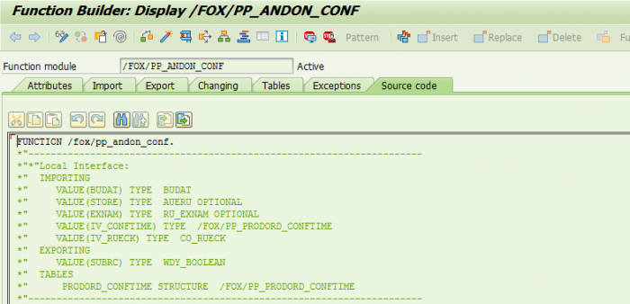 The RFC function module name is /FOX/PP_ANDON_CONF