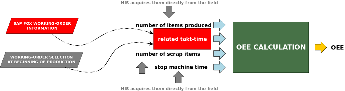 Number of items produced, number of scrap, stop machine should be acquired by NIS directly from the field through NIS's devices. In this way NIS calculates and stores OEE at specific time horizon (each hour, each shift, each day).